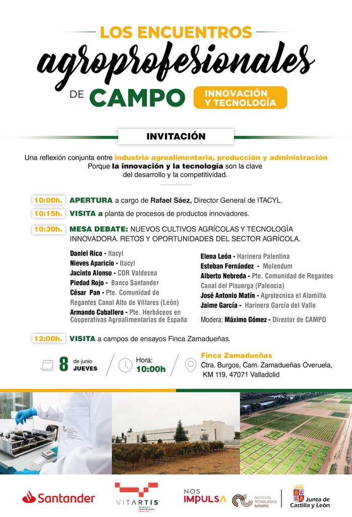 Productores e industrias agroalimentarias de Castilla y León están convocados a esta segunda cita, una iniciativa organizada por CAMPO e ITACyL, en colaboración con Vitartis y Banco Santander, que dará la oportunidad a los asistentes de conocer algunas de las principales instalaciones del Instituto, como la Planta de Procesos y Productos Innovadores o los campos de ensayo de la Finca Zamadueñas