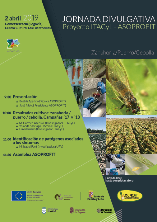 Jornada de difusión de los resultados alcanzados hasta el momento en el proyecto NUEVAS ESTRATEGIAS PARA MITIGAR LOS DAÑOS CAUSADOS POR LAS ENFERMEDADES DE ESPECIES HORTÍCOLAS DE RECIENTE APARICIÓN, en el que participan ITACyL y ASOPROFIT. Se explicarán los trabajos realizados por las dos entidades participantes y, además, se ha invitado a participar a los colaboradores externos del proyecto.