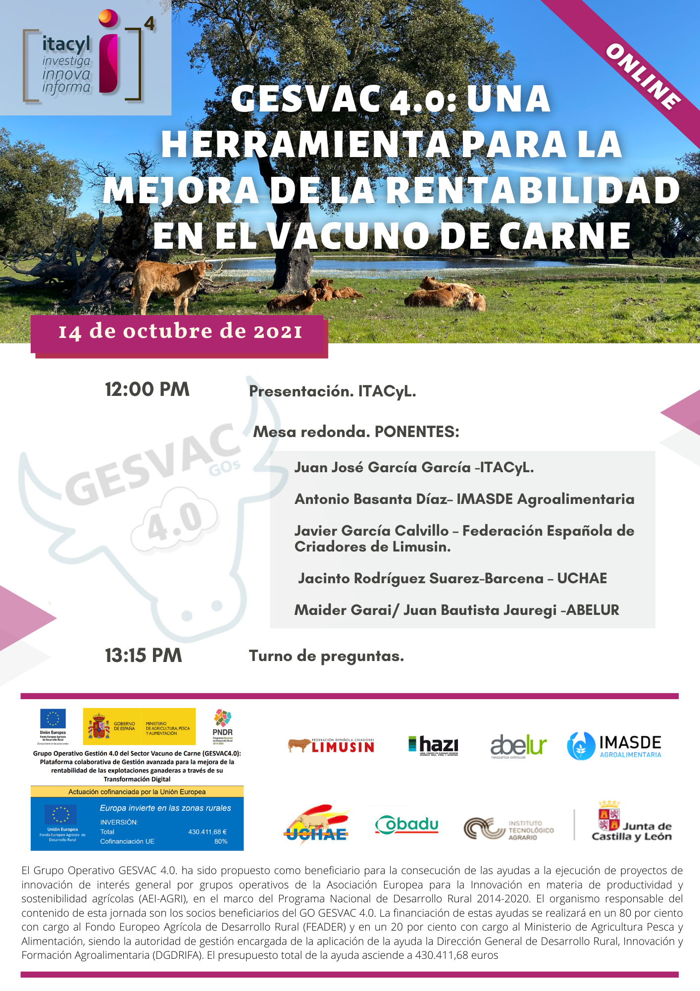 El ITACyL, como miembro del Grupo Operativo Gesvac 4.0, organiza esta jornada online en la que se analizarán las potencialidades para la mejora de la rentabilidad en el sector del vacuno de carne y cómo a través de esta plataforma colaborativa a nivel nacional se desarrollarán las herramientas necesarias para conseguirlo, mediante la implementación de la tecnología Living Lab.