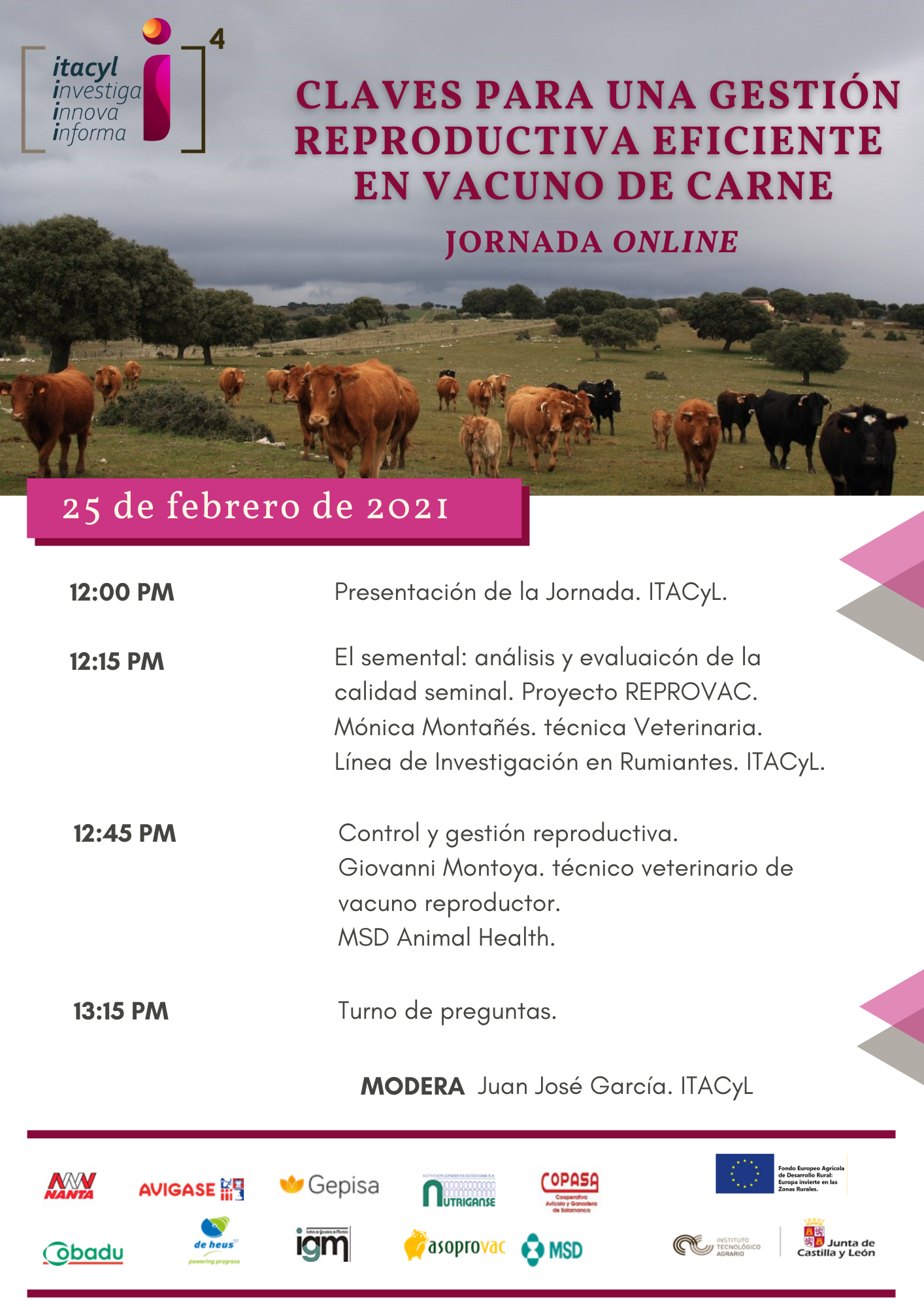 El ITACyL celebra el día 25 de febrero una nueva jornada online bajo el título 'Claves para una gestión reproductiva eficiente en vacuno de carne'. La Jornada está dirigida a técnicos y ganaderos del sector vacuno de carne y se realiza en el marco del proyecto REPROVAC, cuyo objetivo es mejorar los índices de fertilidad de vacuno de carne.