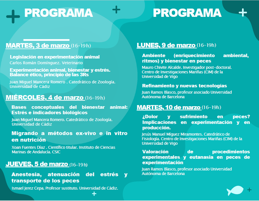 El programa aborda legislación, estrés y bienestar, anestesia, transporte, enriquecimiento ambiental, nuevas tecnologías, dolor y eutanasia en peces, con la participación de expertos universitarios y especialistas del sector.