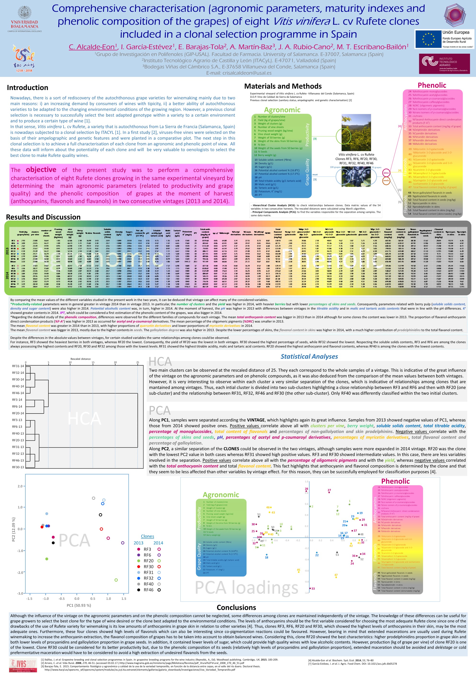 - Alcalde-Eón, C.; García-Estevez, I.; Barajas-Tola, E.; Martín-Baz, A.; Rubio, J.A.; Escribano-Bailón, M.T. 2017. Comprehensive characterisation (agronomic parameters, maturity indexes and phenolic composition of the grapes) of eight Vitis vinífera L. cv Rufete clones included in a clonal selection programme in Spain. 100 In Vino Analytica Scientia Symposium (IVAS). Salamanca (Spain).