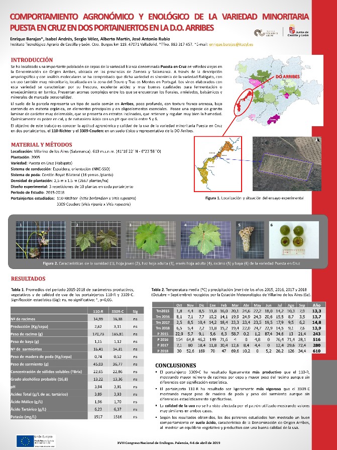 - Barajas, E.; Andrés, I.; Vélez, S.; Martín, A.; Rubio, J.A. Comportamiento agronómico y enológico de la variedad minoritaria Puesta en Cruz en dos portainjertos en la D.O. Arribes. XVIII Congreso Nacional de Enólogos. Palencia, 4-6 de abril de 2019.