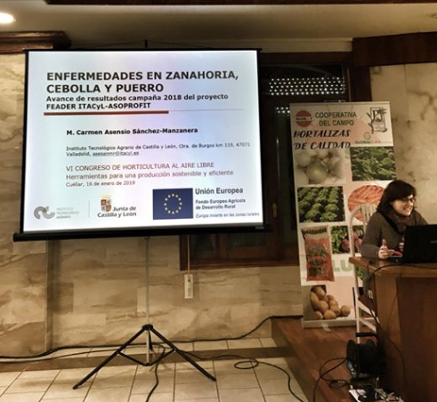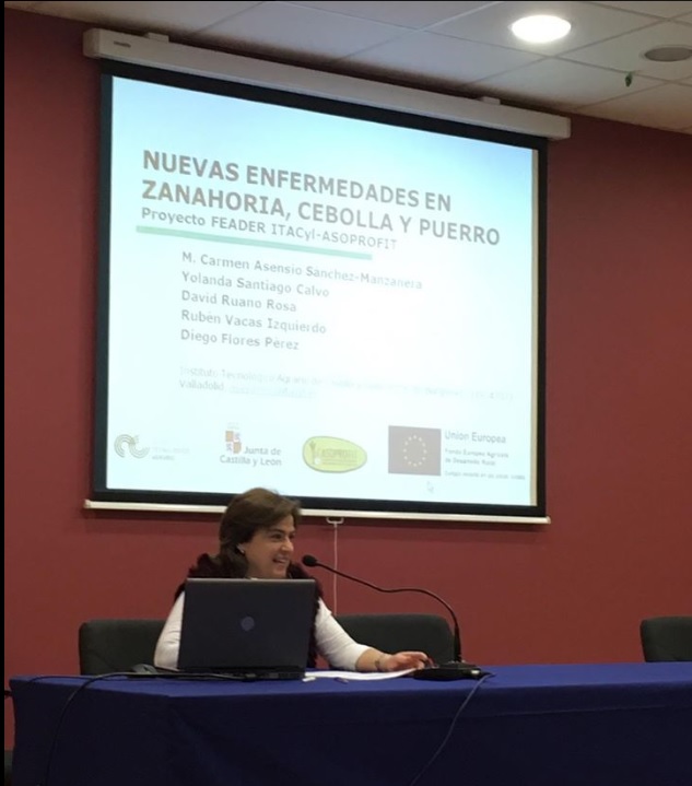 - Asensio-S.-Manzanera, M.C. Enfermedades en zanahoria, cebolla y puerro. Avance de resultados campaña 2018 del proyecto FEADER ITACyL-ASOPROFIT. Comunicación oral en el VI Congreso de Horticultura al Aire Libre en Cuéllar (Segovia). Enero de 2019.