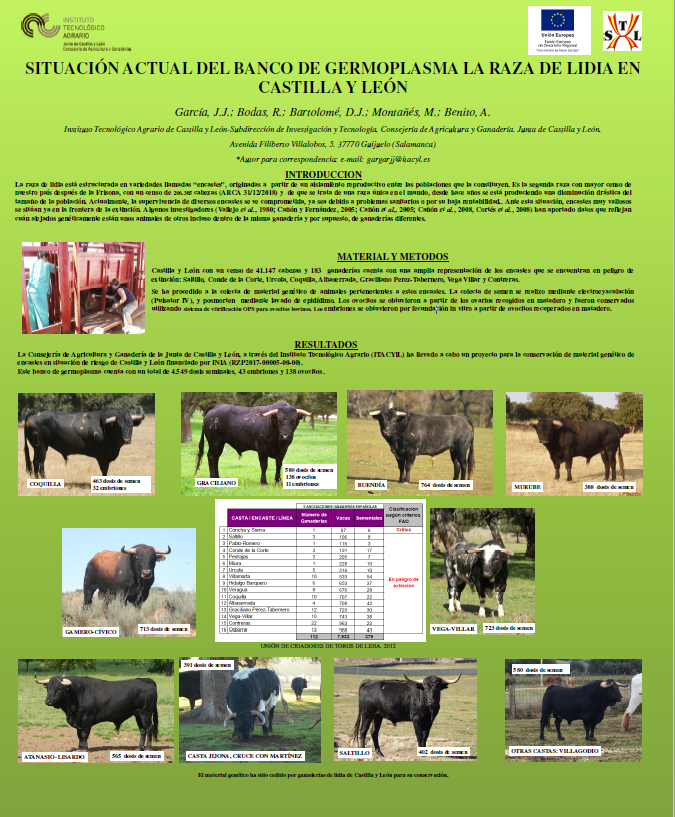 - Presentación de resultados en XIV SYMPOSIUM DEL TORO DE LIDIA. 2019. 2019. SITUACIÓN ACTUAL DEL BANCO DE GERMOPLASMA LA RAZA DE LIDIA EN CASTILLA Y LEÓN. García, J.J.; Bodas, R.; Bartolomé, D.J.; Montañés, M.; Benito, A. http://www.simposiotorozafra.org/index.php?codigo=997